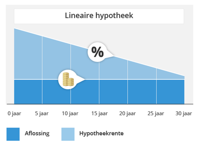 - bij de lineaire hypotheek betaalt u het minste aan rente, gemeten over de gehele looptijd